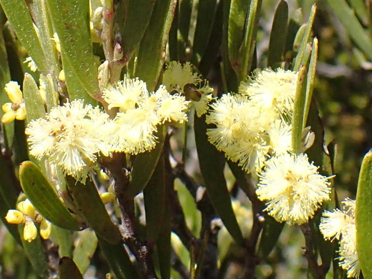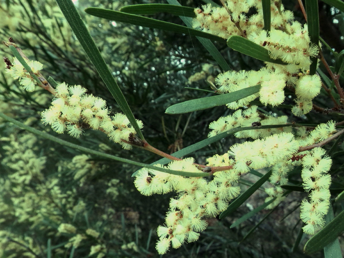 Flora: The buds with 3 or 4 sepals and petals open to profuse, loose, lemon/yellow flower spikes. They grow from the phyllode axils on approximately 3cm long stems which are usually longer than the phyllodes.