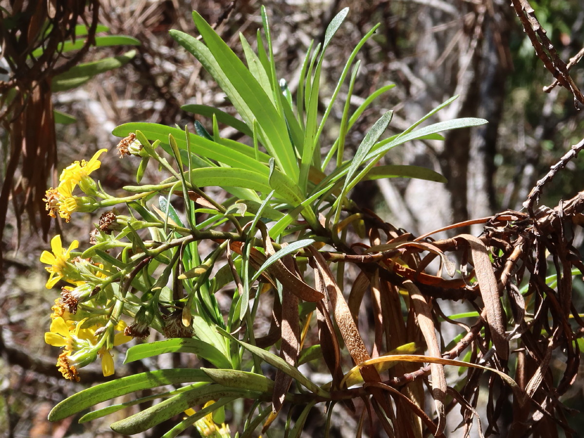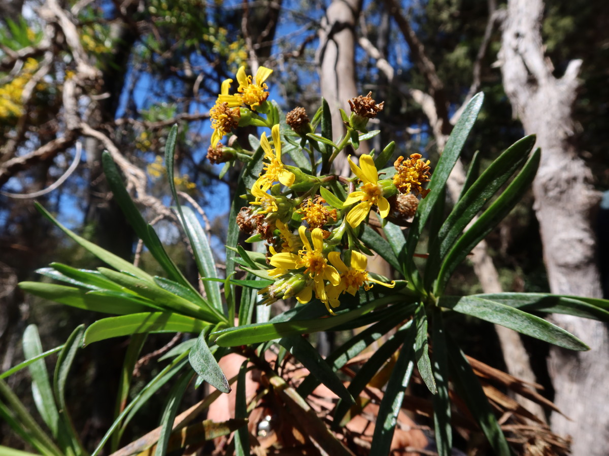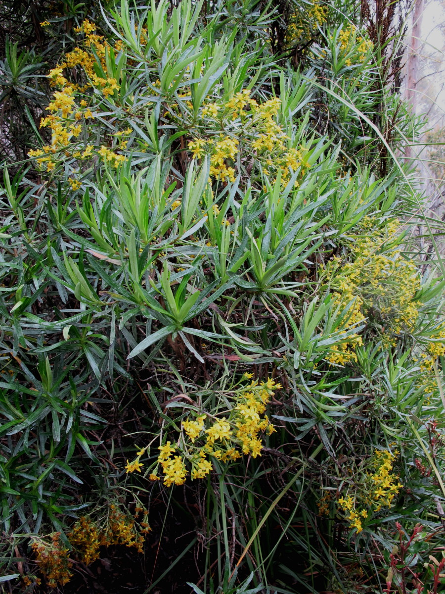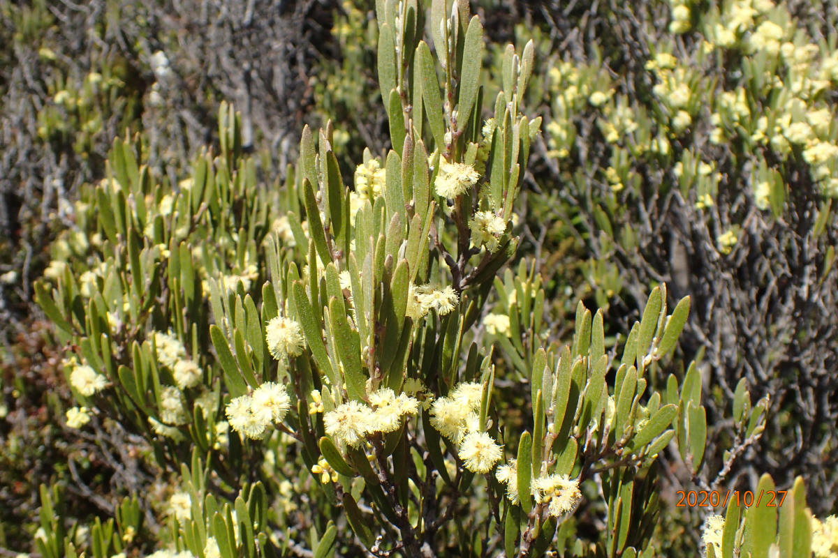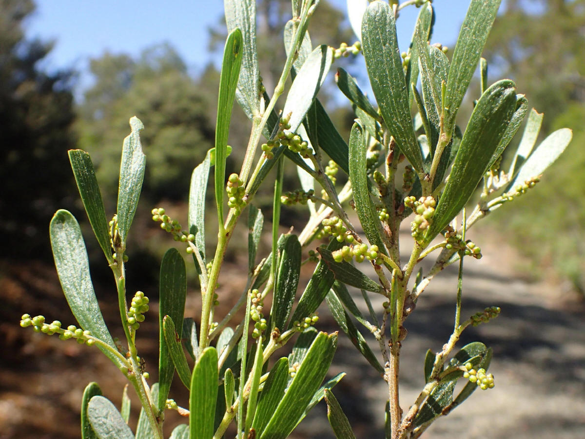 Foliage: The linear or narrow oblanceolate, leathery phyllodes are usually about 5 to 6cm long by 3 to 5mm wide with a blunt or mucronate apex. They have 3 to 5 prominent longitudinal veins and faint lateral reticulations. These reticulations are more prominent in montane habitats where the phyllodes are only about 2cm long.