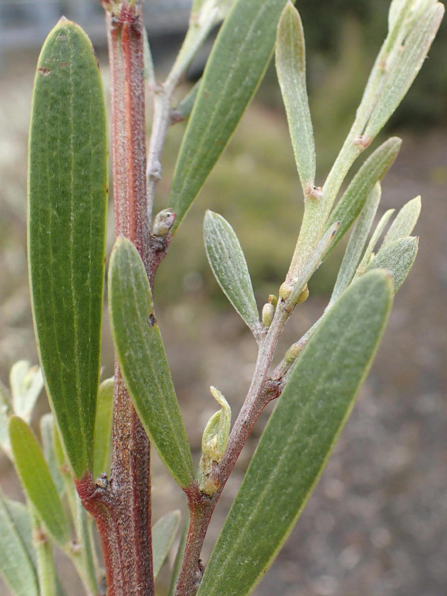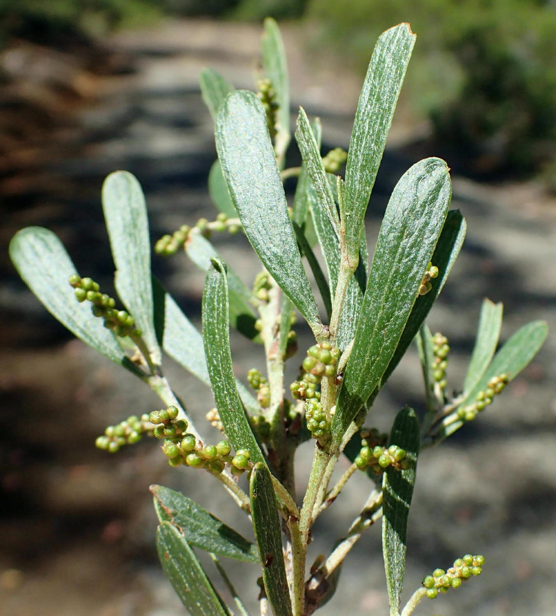 Foliage: The young branches are angular and when growing in the sun can colour to reddish brown. When they mature, the branches and their bark become glaucous. The grey-green to bluish glaucous phyllodes are 2 to 6cm long by 8 to 20mm wide, alternate and variable in shape from narrowly oblong-elliptic to oblanceolate or obovate. The phyllode edges and the midrib are prominently thickened and an obvious small oval gland forms 2 to 10mm from the stem on the upper edge. The phyllodes edges curve and taper to a mucro tip. On the younger stems, ridges form down the stems from the bases of the phyllodes, and when the phyllodes drop dark purple/brown scars remain on the stems.
