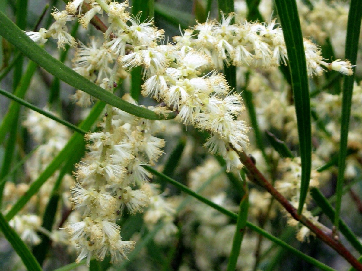 Flowers: The loose axillary cream/yellow flower spikes are shorter than the phyllodes.