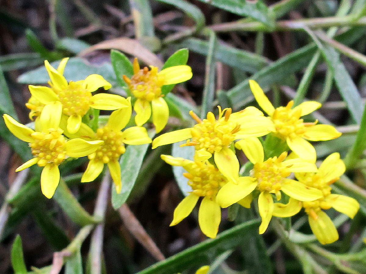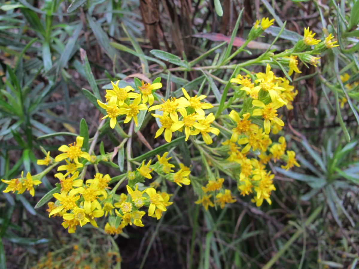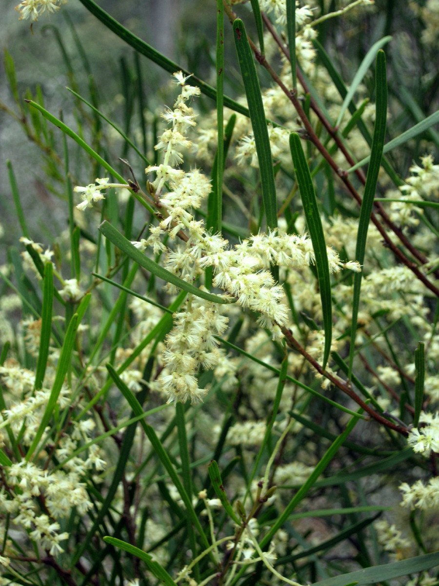 Foliage: The scattered or almost whorled, often semi-erect and clustered, dark green phyllodes are 1.2 to 4.5cm long by 1.5 to 3.0mm wide. They are narrow linear and the apex tapers to a sharp point. They usually have one prominent central vein but also sometimes have fainter, prominent, lateral veins.