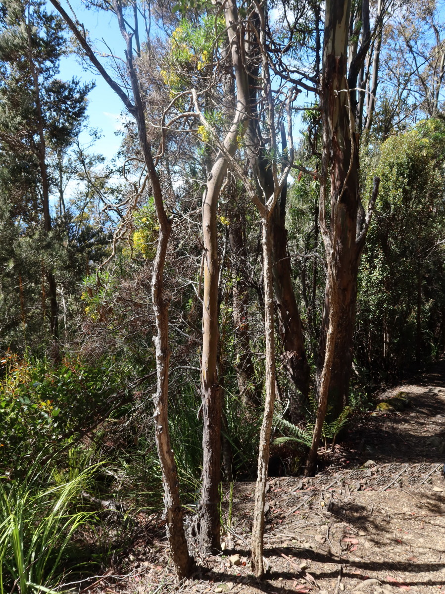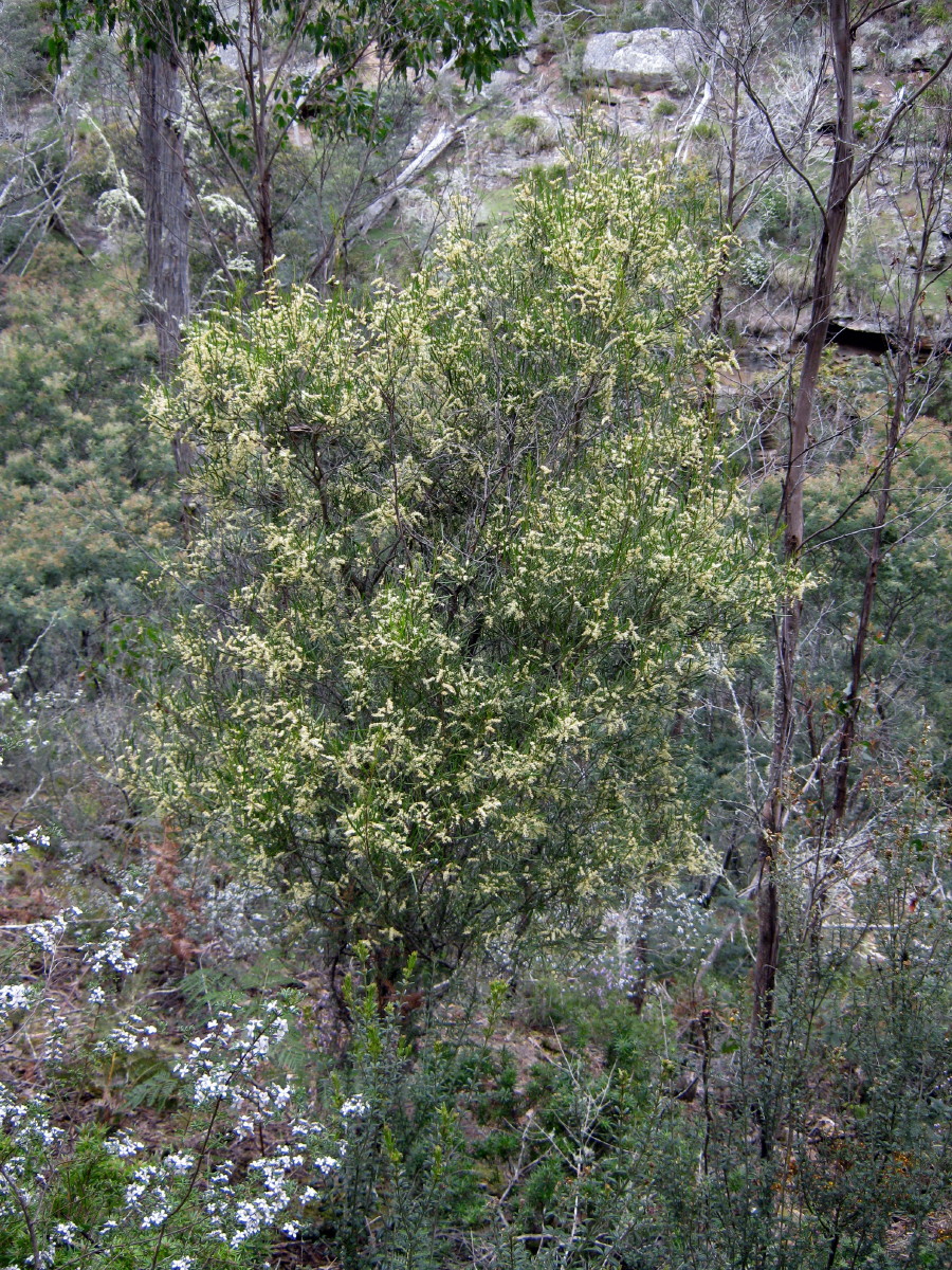 How and where it grows: In the north east this species grows as a glaucous tall shrub or small tree in moist gullies and flats, mountain summits, slopes and plateau scarps in low woodland to tall open, dry, wet and mixed Eucalyptus forests. In the southern midlands it grows as a small, open, glaucous shrub on a dry open lightly timbered rocky hillside. In both locations the plants spread by rhizomatous suckers, possibly as an evolutionary survival defence to the gall infestations.