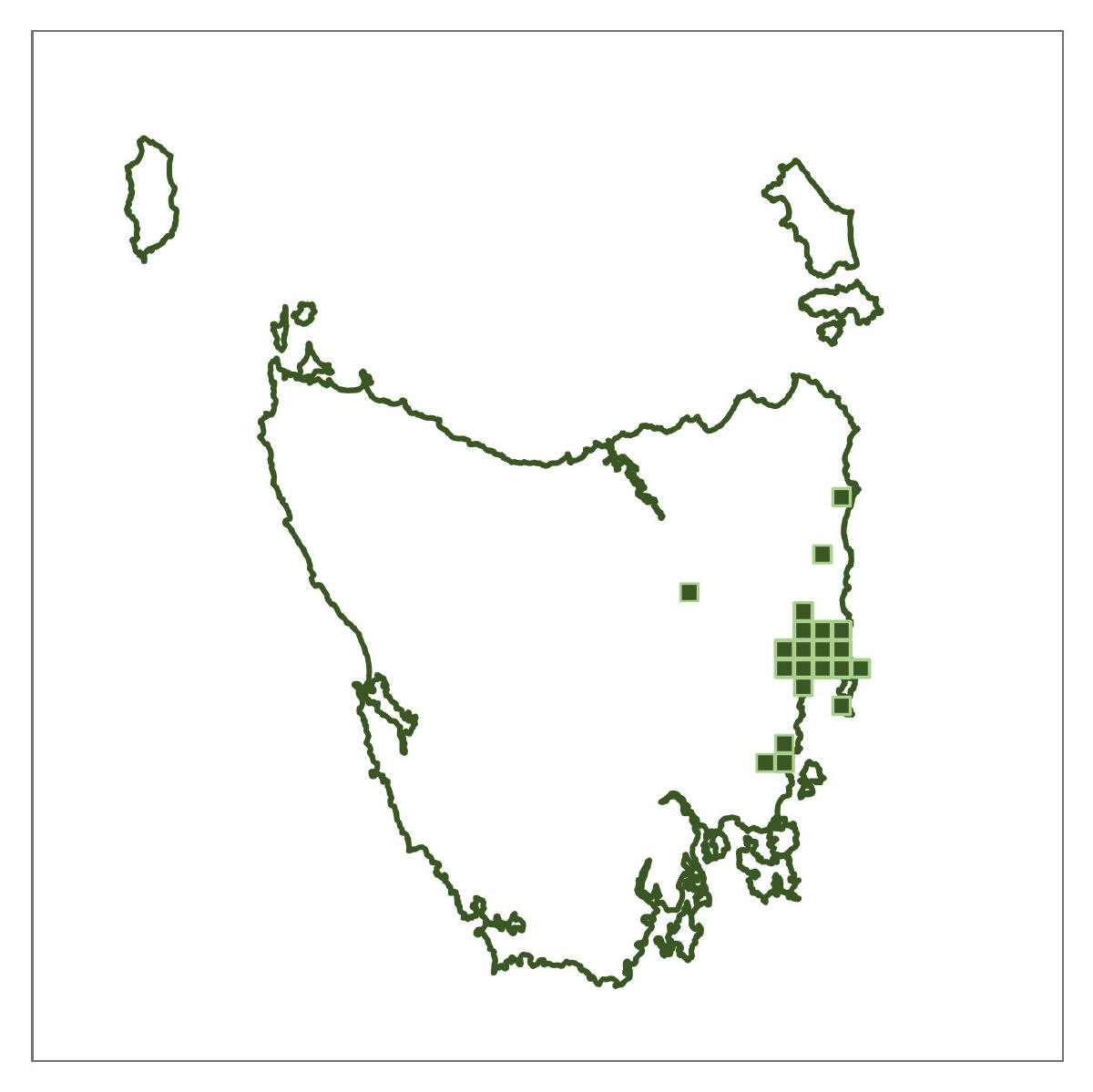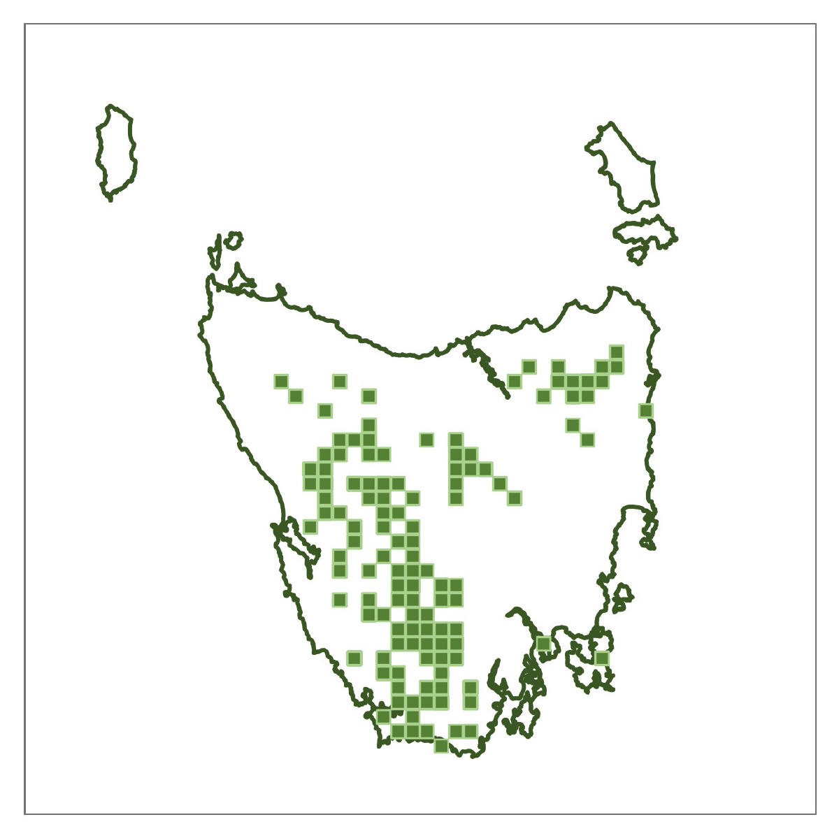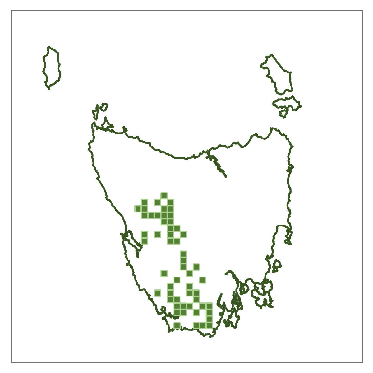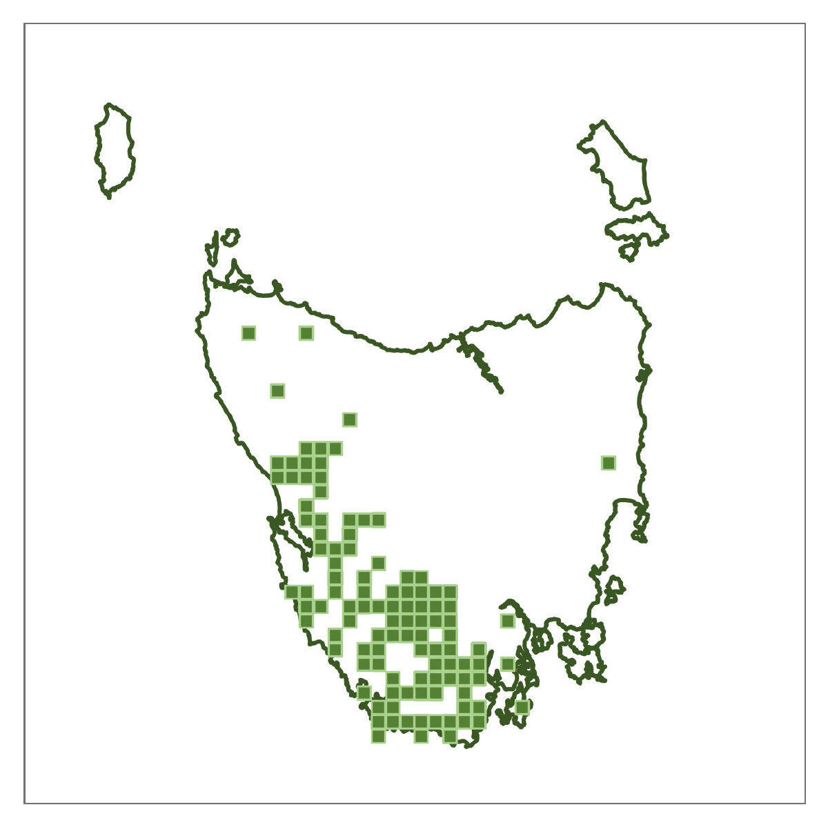 Where found: Coolangatta Road, Mount Mangana, South Bruny Island; Springs area and Mount Connection Track, kunanyi/Wellington Park; Platform Peak and Mount Dromedary, Mount Dromedary Conservation Area; Road to Hartz Mountain, Hartz National Park (NP); Below Lake Fenton and above Lake Dobson in Mt Field NP; Near Mount Arrowsmith, Philps Creek on the Frenchmans Cap Track and, Franklin River at Lyell Highway Bridge, Franklin-Gordon Wild Rivers NP; South Coast Track above Lousy Bay, South West NP.