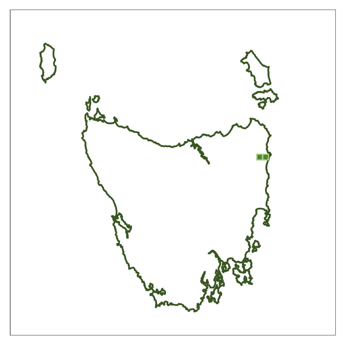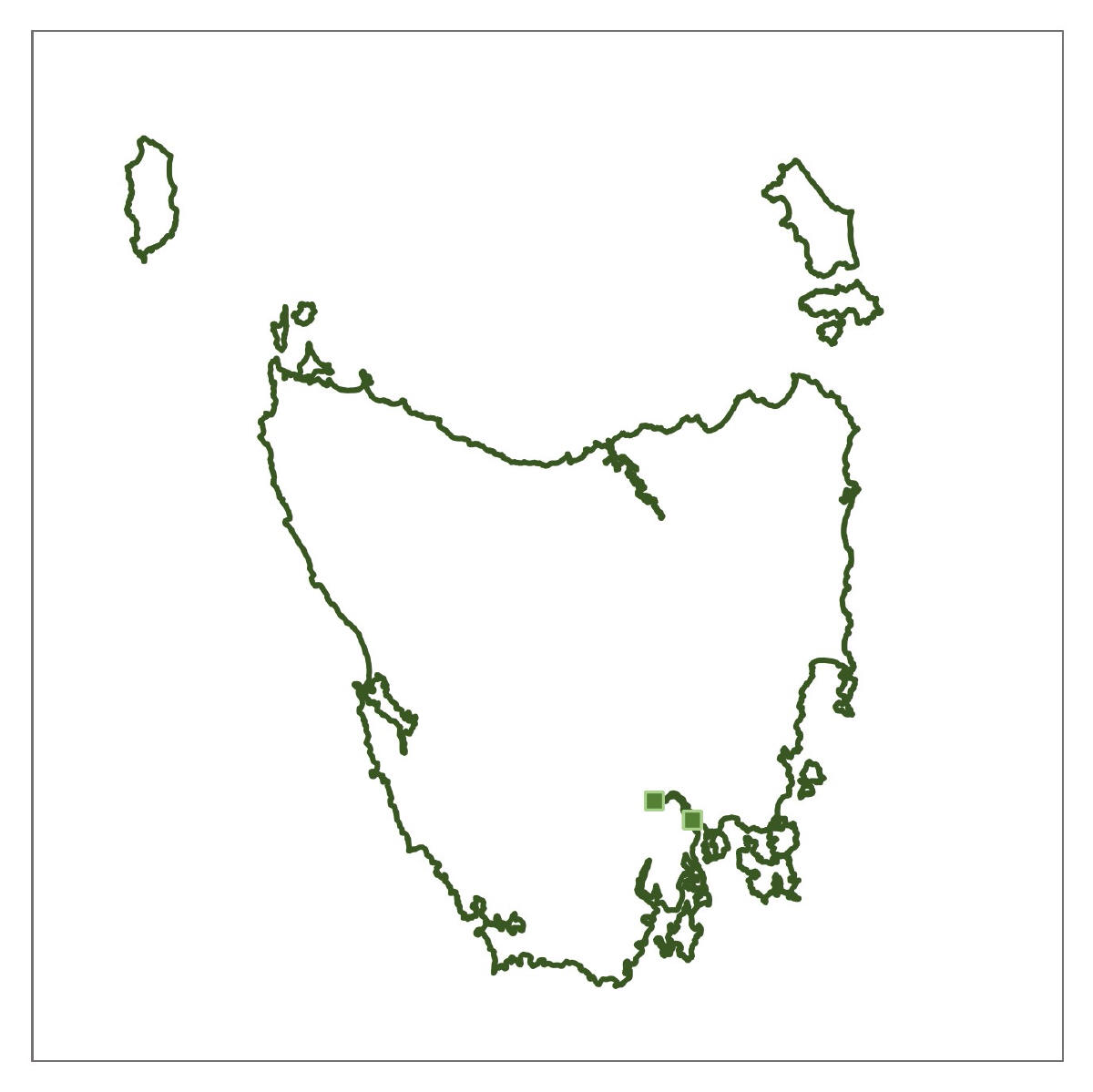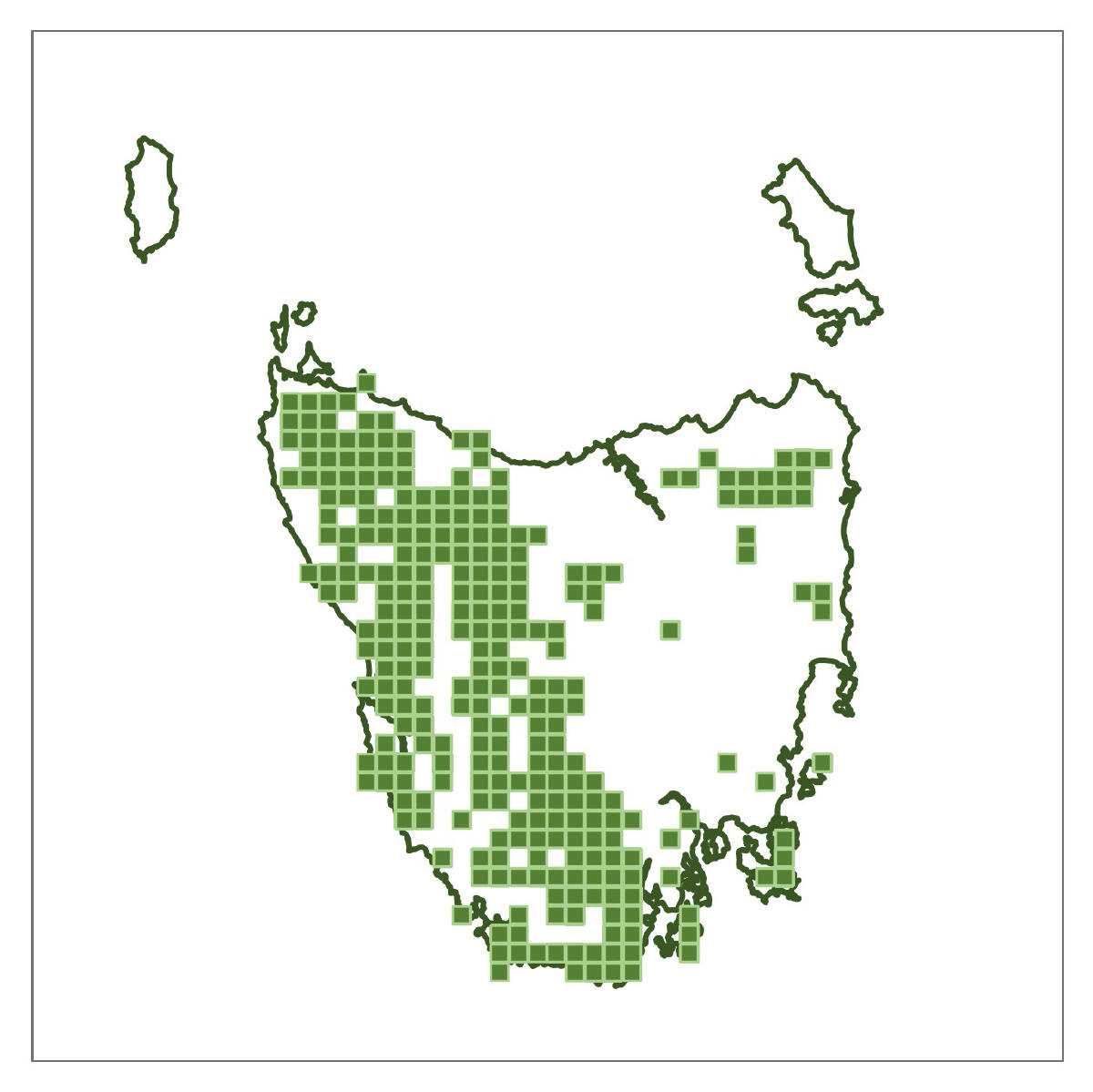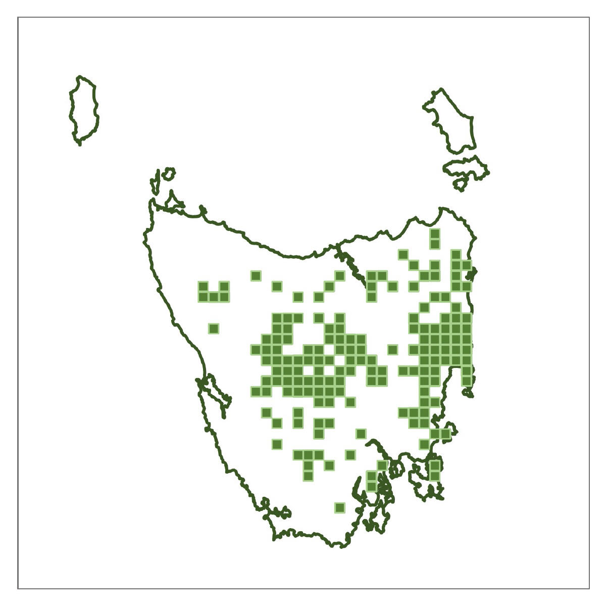 Where found: Coolangatta Road, Mount Mangana, South Bruny Island; Springs area and Mount Connection Track, kunanyi/Wellington Park; Platform Peak and Mount Dromedary, Mount Dromedary Conservation Area; Road to Hartz Mountain, Hartz National Park (NP); Below Lake Fenton and above Lake Dobson in Mt Field NP; Near Mount Arrowsmith, Philps Creek on the Frenchmans Cap Track and, Franklin River at Lyell Highway Bridge, Franklin-Gordon Wild Rivers NP; South Coast Track above Lousy Bay, South West NP.