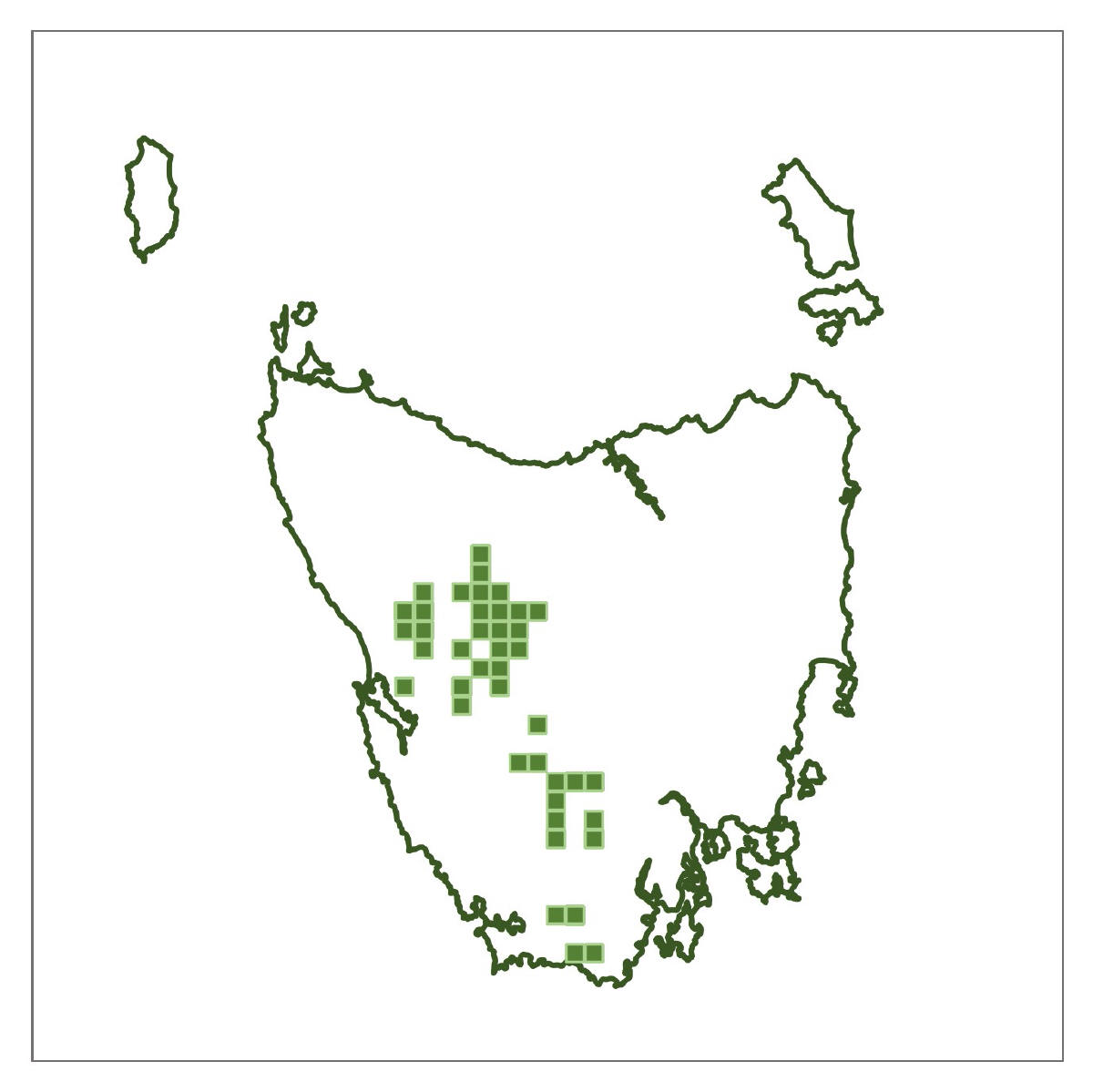 Where found: South Wellington and Thark Ridge Tracks, Pinnacle Road and other sub-alpine places in kunanyi/Wellington Park; Ski field area Mount Field East, and Mount Field West, Mount Field National Park (NP); western face Precipitous Bluff, South West NP; Hartz Mountain Track, Hartz Mountains NP; Mount Gell and Wylds Craig Franklin and Gordon Wild Rivers NP; below and on the peak of Eldon Bluff, Cradle Mountain Lake St Claire NP; Mount Albert; Mount Barrow; Ossians Throne, Ben Lomond NP; other alpine areas throughout Tasmania.