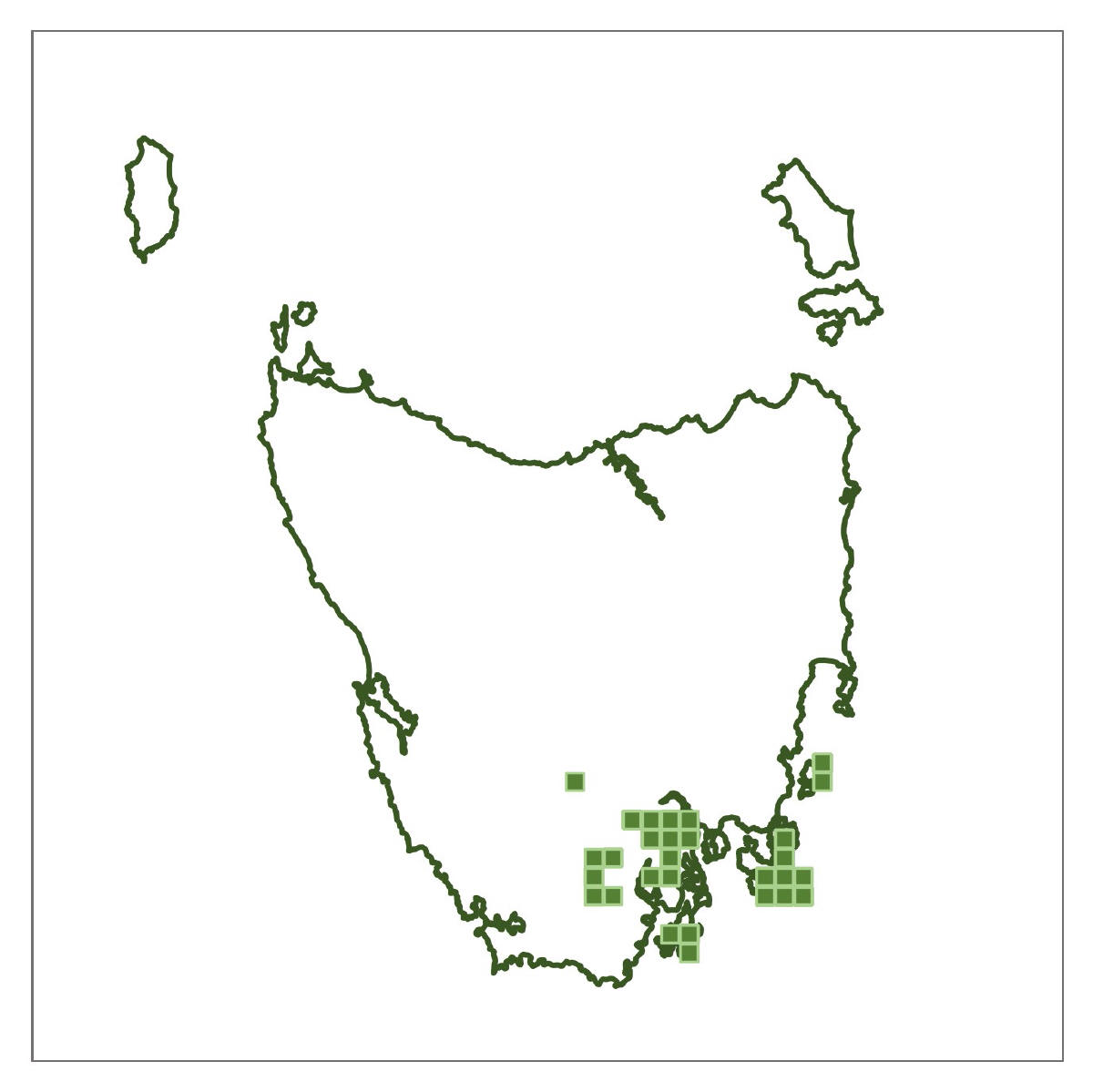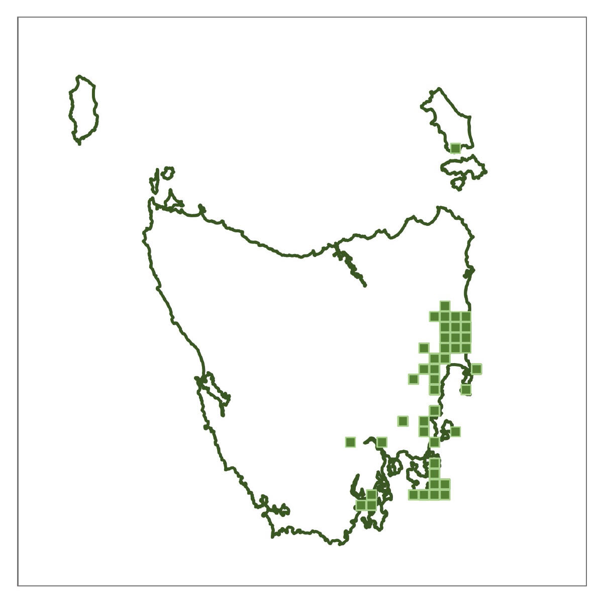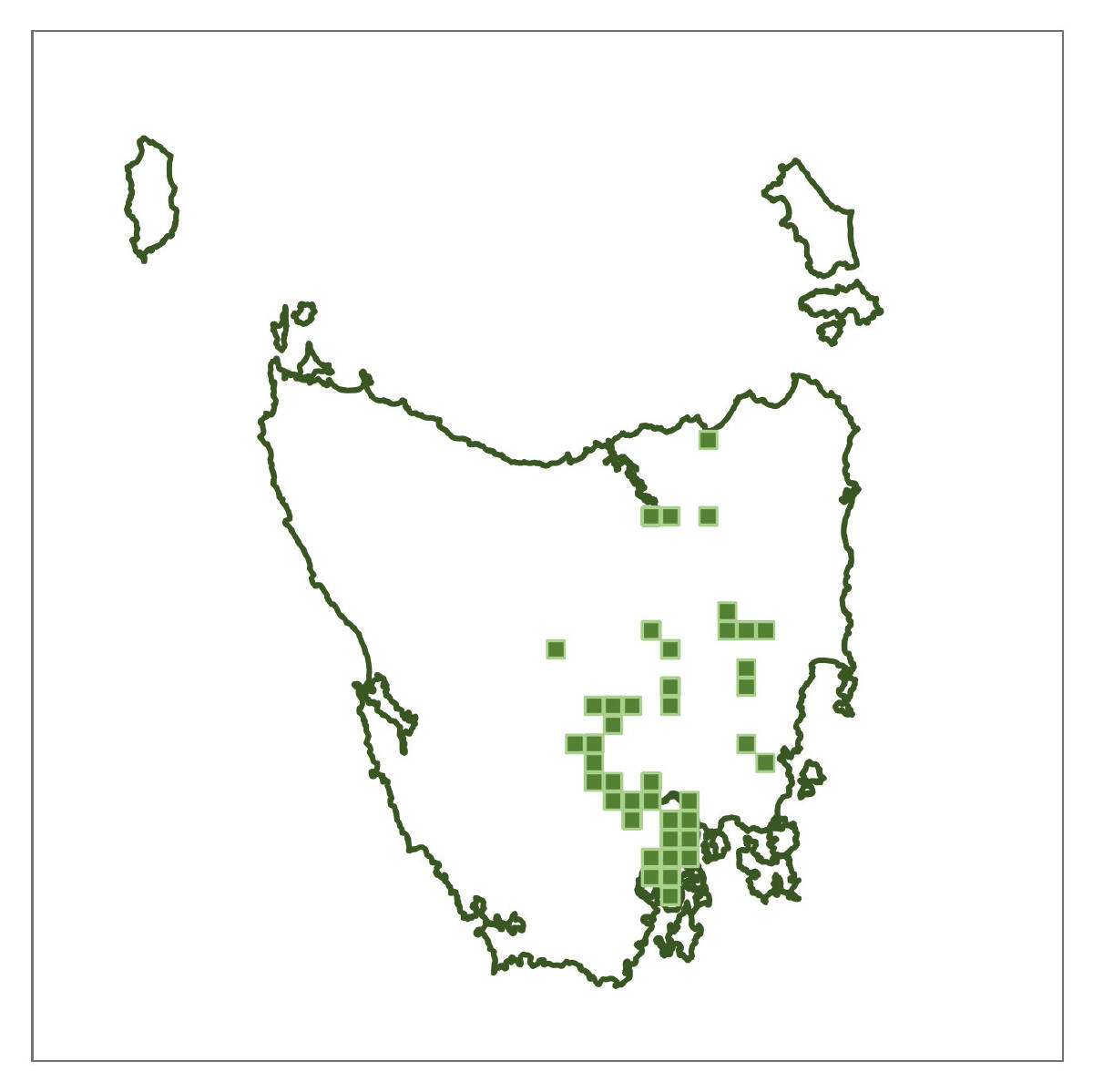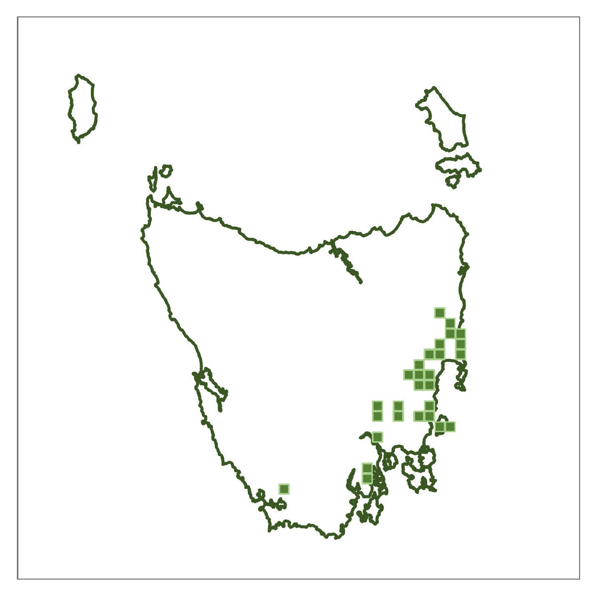 Where found: Gunners Quoin, Meehan Range Reserve; Quoin Mountain, Kepton; Shipstern Bluff Track, Tasman National Park; Middle Hill and Perpendicular Mountain, Maria Island; Brown Mountain; Tobys Hill, Huon Valley; Snug Falls Road, Snug. Several other places in Tasmania’s south-east.
