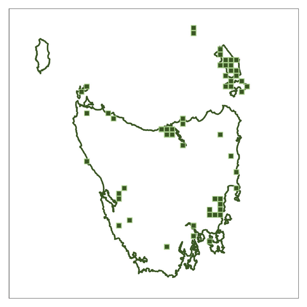 Where found: It has been seen and/or recorded in Bluff River Gorge, Bridport, Buckland; Cheltenham Reserve, Newham; Cradle Mountain Lake St Claire and Rocky Cape National Parks; Liawenee Lake Augusta and Lake Ada areas; north of Flagstaff Hill and the northern Skyline Trail Meehan Range, Cambridge; the Tarkine area; Badger, Bruny, Clarke, Flinders and King Islands; Pelverata Falls Track, Pelverata and many other places throughout the State.