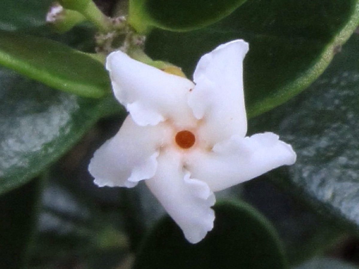 Flowers: The solitary, terminal flowers grow on very short reddish stems bearing one or more pairs of stipules and, immediately below the calyx of the flower, an unequal 4 lobed reddish cupule formed from 2 bracts which are fused with the some of the stipules. The female flower’s 4 to 5mm diameter corolla has 4 spreading and recurved cream/pink/white petals and two or three 8 to 10mm long white stigmas. The male flowers 5 to 6mm diameter corolla’s cream petals are strongly recurved and the 4 stamens are exserted with long fine filaments.