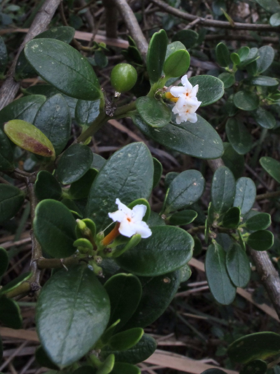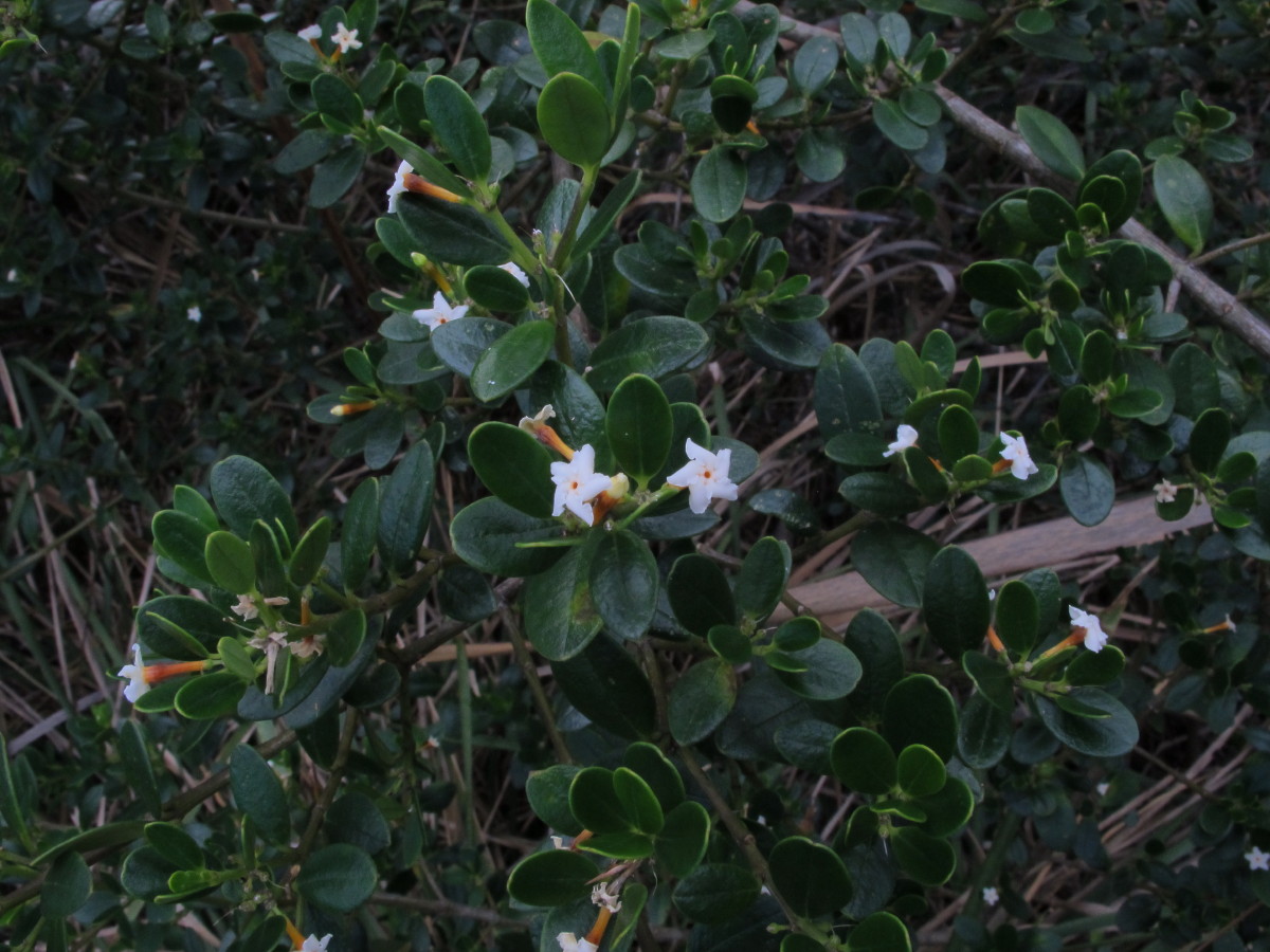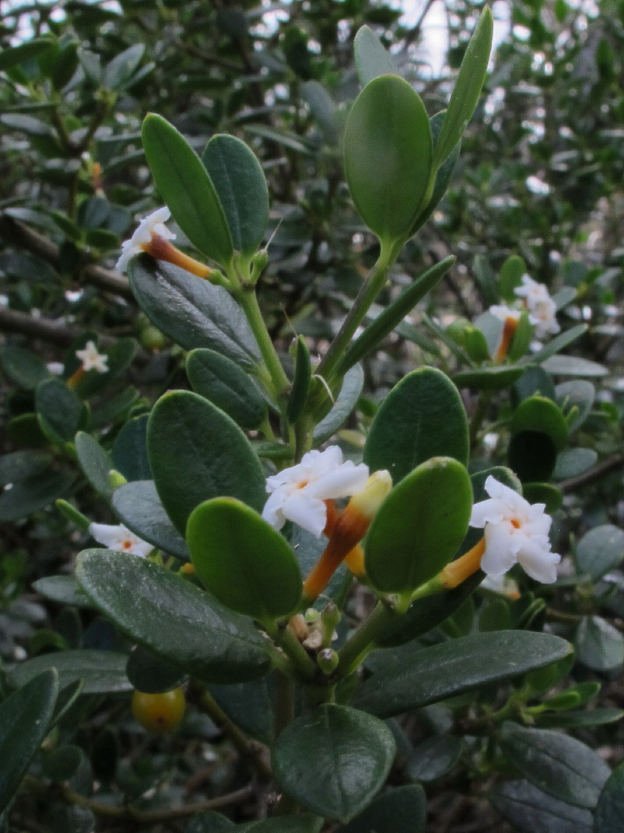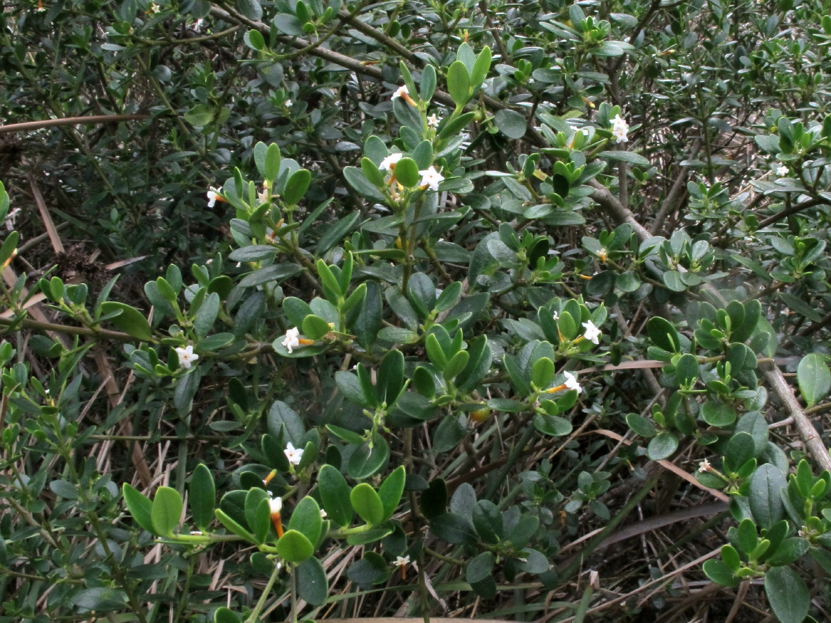 Foliage: The slender branches are usually pubescent. The lateral ones are divaricate and often distichous and ending in fine spines. The numerous small, thin, opposite leaves, are variable, often ovate-lanceolate 4 to 12mm long, sometimes narrow elliptical-lanceolate 20 to 25mm long. They are glabrous or puberulent, have a short stem and the apex is acute or blunt and apiculate.