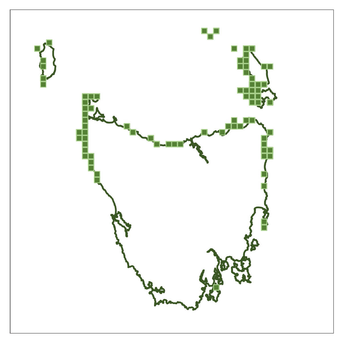 Where found: Freycinet including Schouten Island, Narawntapu, Rocky Cape, Tasman and Mt William National Parks; Bruny, Clark, Cape Barron, Erith, Flinders, King, Maria and Tasman Islands; Bellbuoy Beach, Boobyalla Beach, Cape Portland, Little Swanport, Peta Point, Port Dalrymple and several locations down the South Esk River.