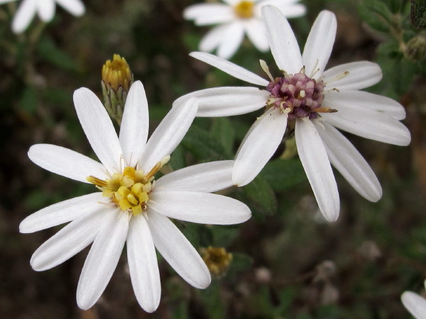 Flowers: The daisy form, occasionally blue, mauve or pink but usually white, flowers grow in dense terminal clusters on the side branches. The very numerous flowerheads are stalked with the peduncle typically ebracteate and longer than the leaves but shorter and more or less leafier in some variants. They are often solitary and terminal at the ends of short axillary branches along the length of the stem and sometimes in few-flowered terminal and axillary panicles. The turbinate, 4 to 5mm long involucre have lanceolate, subacute and tomentose phyllaries sometimes with purplish edges and tips. These flowerheads are about 2cm diameter with 20 to 26 usually white but occasionally blue, mauve or purplish florets of which about half are ligulate.