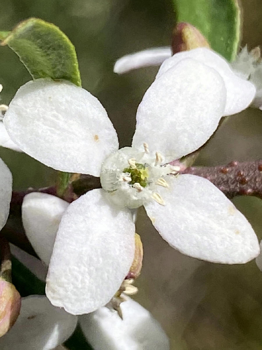 Flowers: The axillary inflorescences, with no obvious peduncle, have 1 to 3 flower clusters of 4 or 5 flowers. The small broadly triangular sepals of the flowers are about 1mm long. These white to pale pink flowers have 4 or 5, 4 to 6mm long, broadly elliptical petals. The stamen’s are flattened and ciliolate then abruptly narrow toward the apex, while the anthers are minutely apiculate.