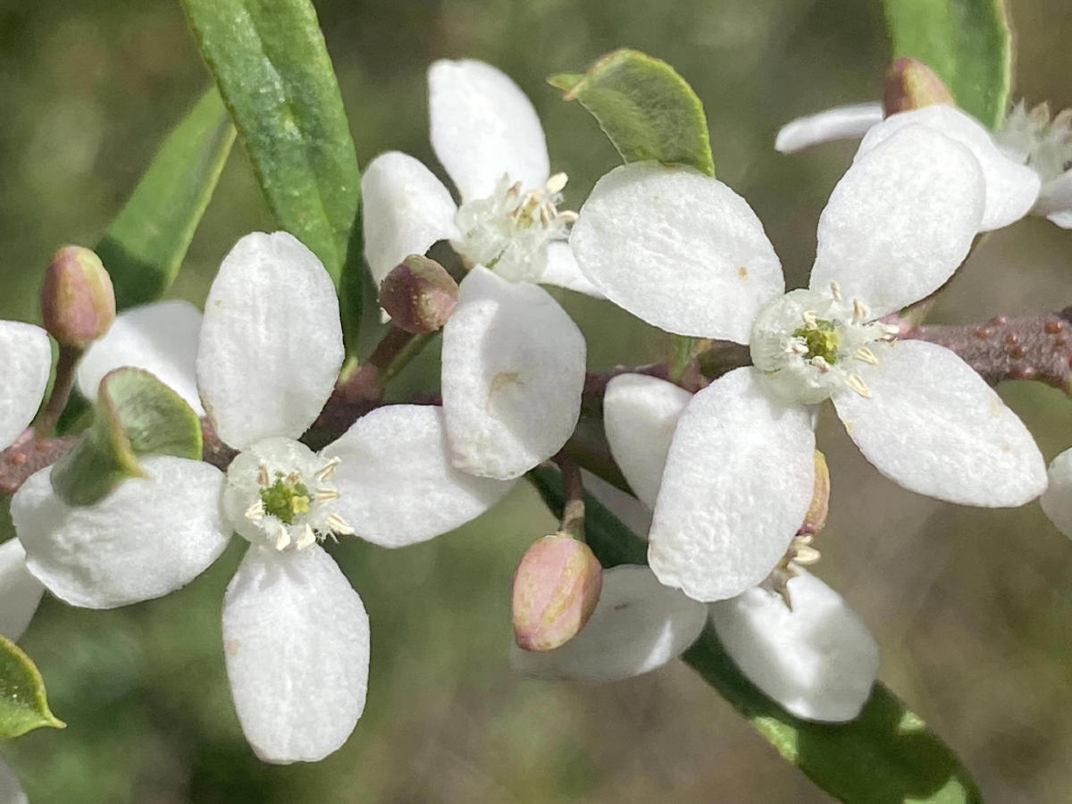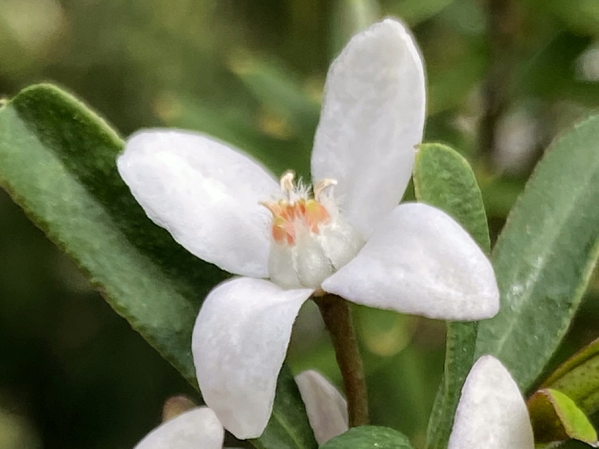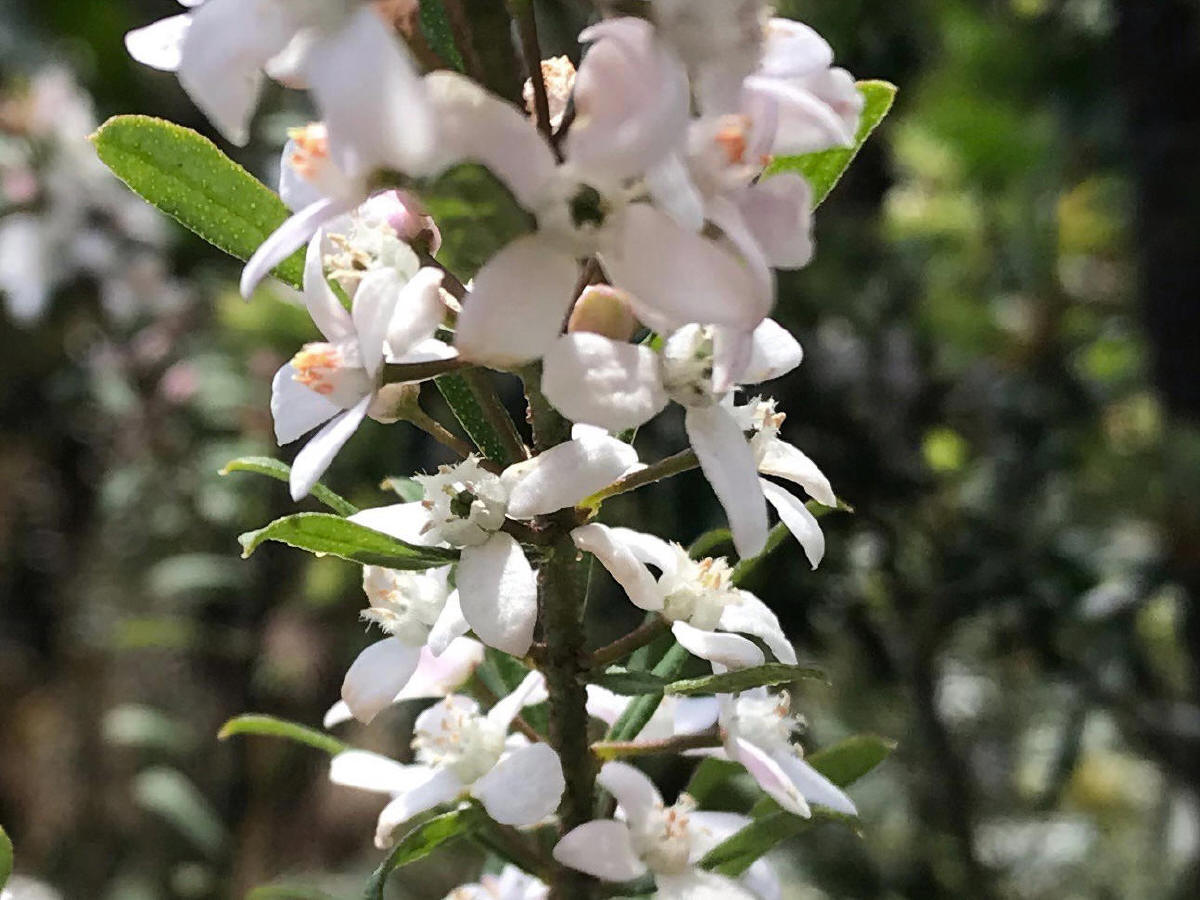 Flowers: The small white/cream terminal flower clusters which may appear to be axillary because of the shortness of branchlet, have 2 leaf-like bracts and 2 central orange stamens. As the flowers mature they tend to develop a pink throat.