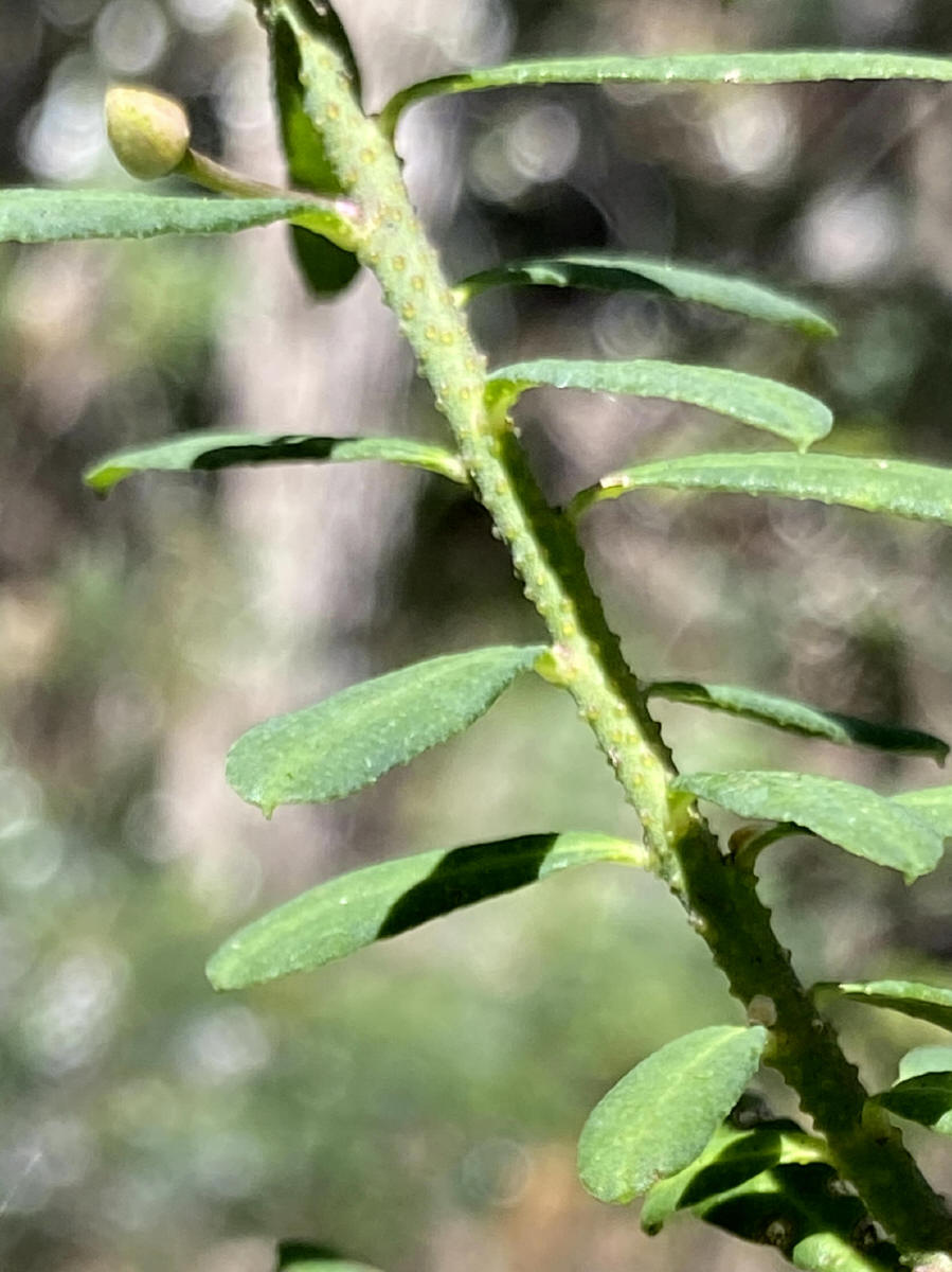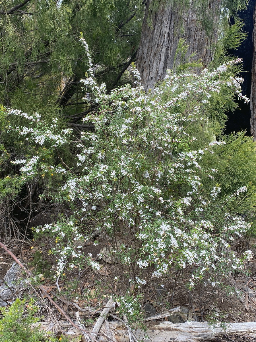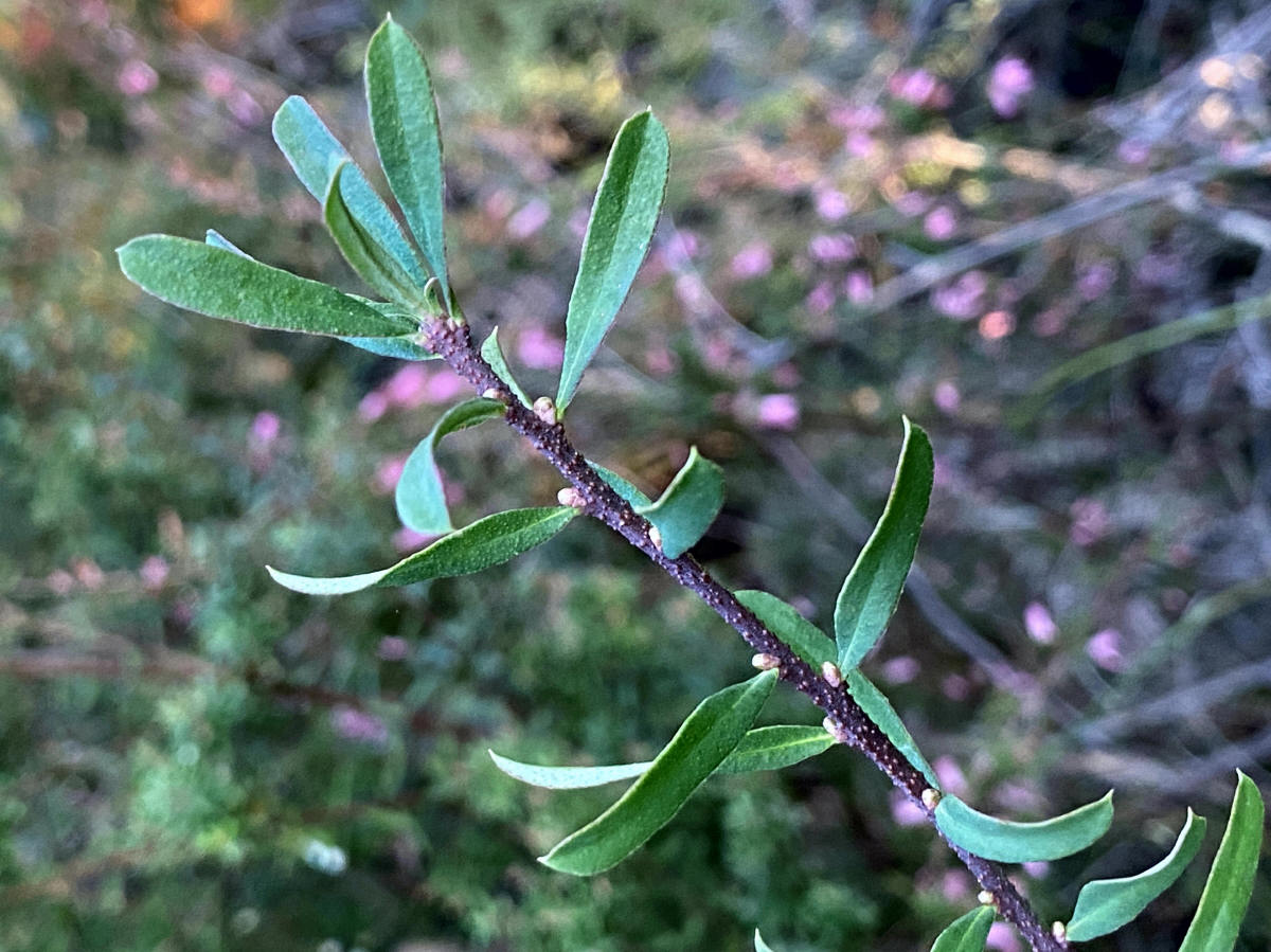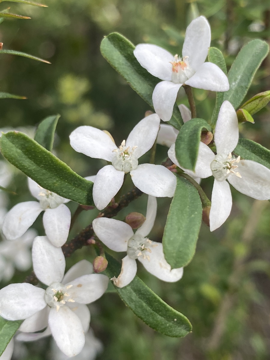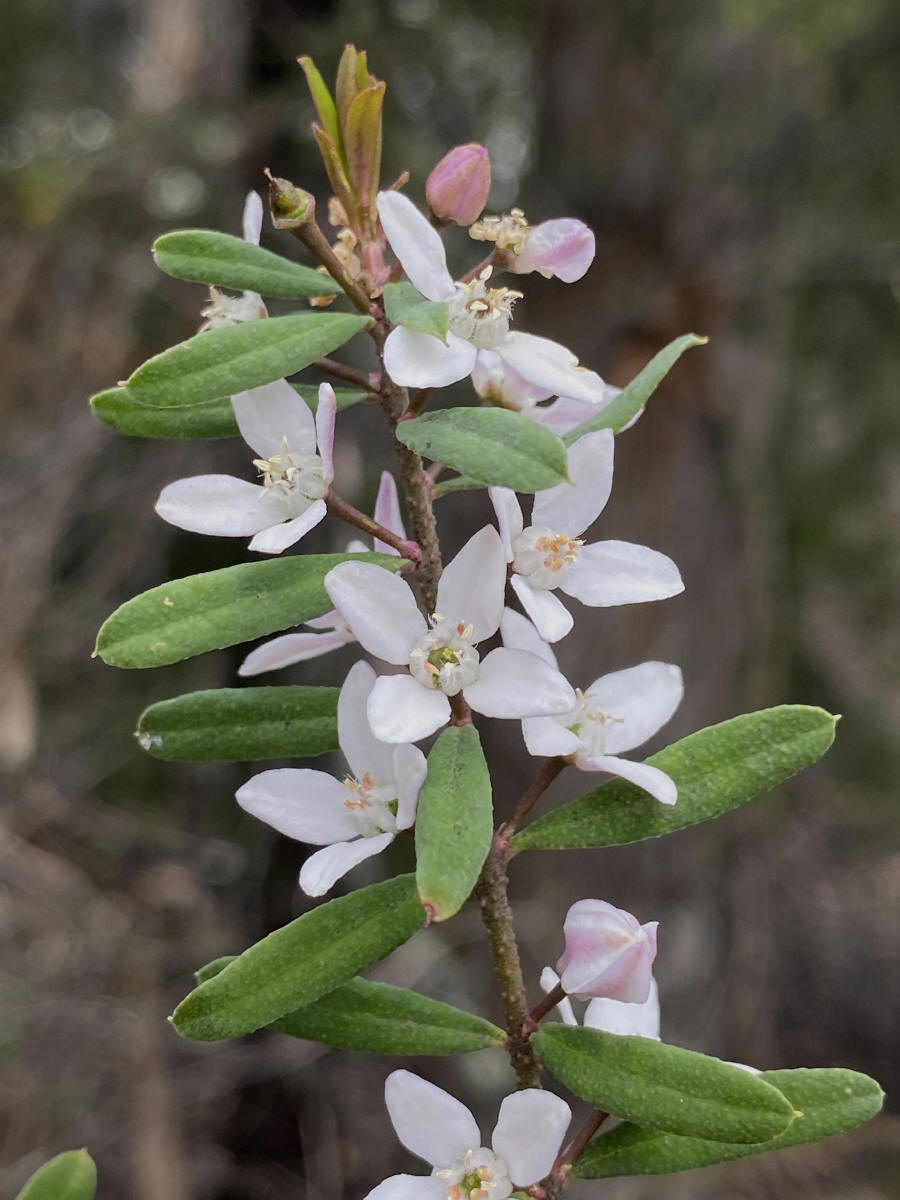 Foliage: The branchlets are glabrous and glandular tuberculate. The rather crowded, thinly textured, discolorous, aromatic leaves, 1 to 2.5cm long by 2.0 to 5.5 and up to 8mm wide, are elliptical or obovate to obcuneate in shape and dotted with many small oil glands. The upper surface is almost shiny and dark green while the lower surface is paler. The edges are glandular-crenate and slightly recurved, and the apex is shortly mucronate.