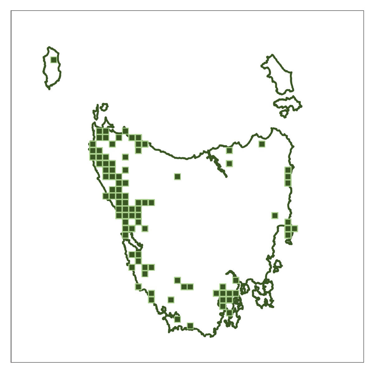 Where found: It may be found in a variety of habitats, often on well-drained rocky substrates in heathy areas, Eucalyptus woodlands and on rainforest margins. It is common in western Tasmania and isolated locations on the east coast from St Helens to Scamander; Freycinet Peninsula; and areas between the Huon River and D’Entrancasteaux Channel.