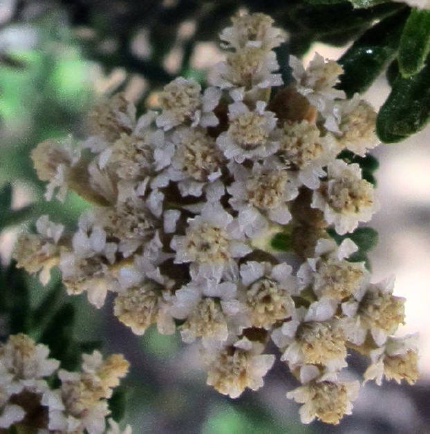 Other notes: This species grows as a tall shrub to small tree with the smaller branches and side stems ending in flower clusters. It also can be trimmed to a hedge. This compact, dark green shrub with masses of white, summer, daisy flowers should be pruned for shape and to remove dead material. It is uncommon in home gardens.