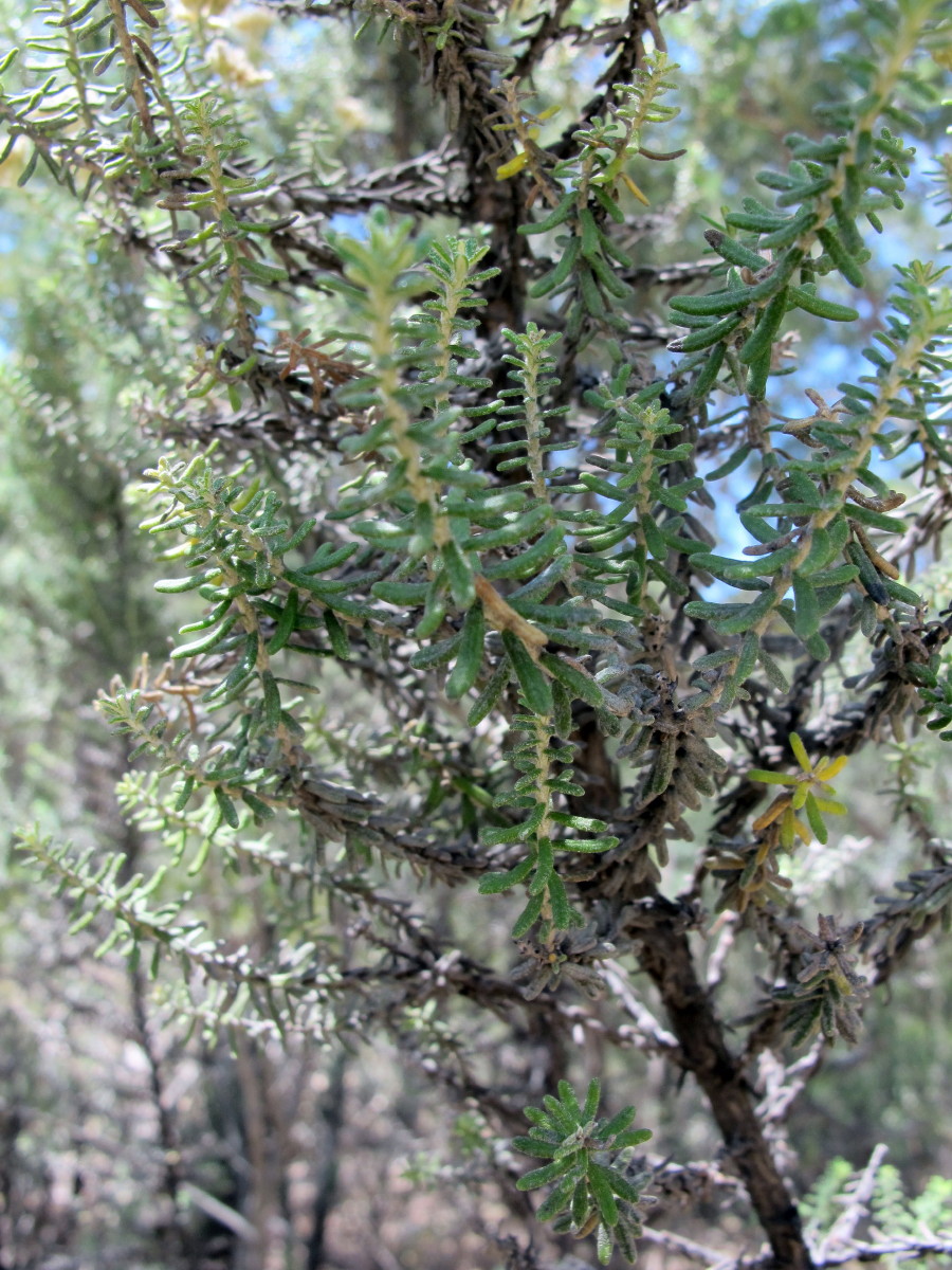 Foliage: The leaves are dark green above, white tomentose below, narrow linear shaped with rolled-under edges, arranged alternately around and along the stems. Toward the tips of the stems the new leaves develop in clusters.
